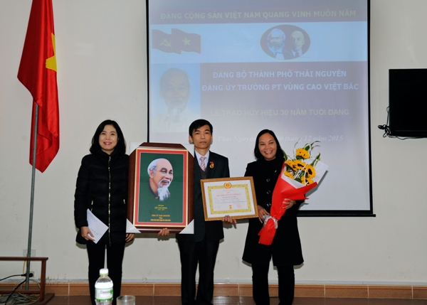 Thay mặt Đảng ủy trường PT Vùng cao Việt Bắc, đồng chí Lục Thúy Hằng - Bí thư Đảng ủy - Hiệu trưởng nhà trường trân trọng trao Huy hiệu 30 năm tuổi Đảng cho đồng chí Nguyễn Thanh Tùng và phát biểu chúc mừng, ghi nhận chặng đường rèn luyện cũng như những đóng góp, cống hiến của đồng chí trong suốt 30 năm đối với sự nghiệp cách mạng của Đảng.