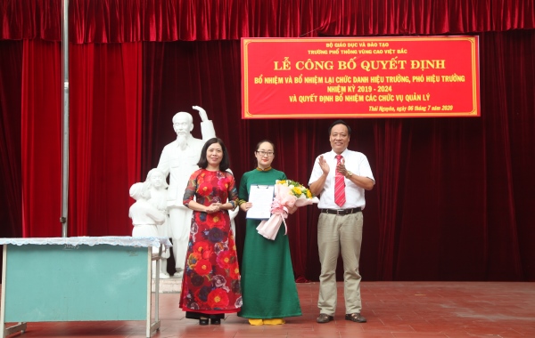 Thực hiện quy trình công tác cán bộ, trong năm học 2019 - 2020 Trường PT Vùng cao Việt Bắc đã tiến hành các bước trong quy trình bổ nhiệm, bổ nhiệm lại chức danh hiệu trưởng, phó hiệu trưởng, các chức danh cán bộ quản lý và trang trọng tổ chức lễ công bố quyết định bổ nhiệm, bổ nhiệm lại năm 2020 cho các đồng chí:
