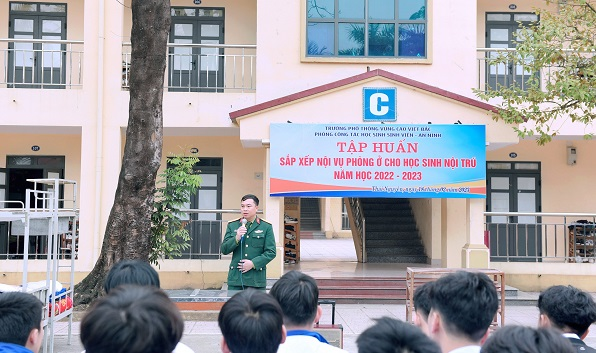 Nhằm đáp ứng những yêu cầu đó, đồng thời góp phần nâng cao kiến thức vệ sinh cá nhân, vệ sinh phòng ở sạch sẽ, gọn gàng, khoa học, tăng cường kiến thức kỹ năng sống trong môi trường tập thể cho các em học sinh trong khu nội trú của nhà trường, chiều ngày 18 tháng 2 năm 2023, phòng Công tác học sinh sinh viên - An ninh đã tổ chức buổi tập huấn “Sắp xếp nội vụ phòng ở cho học sinh nội trú năm học 2022 - 2023”.