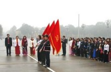 6h30’:Có thông báo đã đến giờ chào cờ, yêu cầu mọi người xung quanh dừng mọi hoạt động. Những đoàn khách tham quan cùng các cô bác tập thể dục gần đấy đều đứng lên, quay mặt về phía lá cờ Tổ quốc. Một đoàn các chú kiêu binh bận quân phục màu trắng, tay bồng súng, đứng trang nghiêm trước lá cờ Tổ quốc. Tiếng nhạc Quốc ca cất lên cùng lúc với lá cờ Tổ quốc từ từ được kéo lên, tung bay trong gió. Mọi người đều đứng trang nghiêm trước lá cờ Tổ quốc, với tấm lòng thành kính, nghiêng mình trước lăng Người.