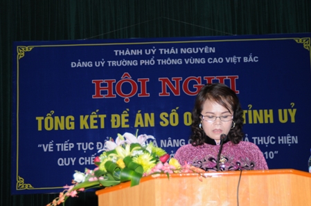 Tại hội nghị, đồng chí Đinh Thị Kim Phương – Bí thư Đảng ủy, hiệu trưởng nhà trường đã trình bày Báo cáo tổng kết đề án số 04 – ĐA/TU ngày 21/09/2006 của tỉnh uỷ về tiếp tục đẩy mạnh và nâng cao hiệu quả thực hiện quy chế dân chủ ở trường PT Vùng cao Việt Bắc giai đoạn 2006-2010. Từ năm 2006 đến nay, Ban chỉ đạo thực hiện Quy chế dân chủ trường PT Vùng cao Việt Bắc đã tham mưu cho lãnh đạo nhà trường, tham mưu cho Đảng ủy chỉ đạo các Chi bộ trực thuộc, Ban chấp hành các đoàn thể triển khai Quy chế dân chủ theo chức năng nhiệm vụ, trong đó đã đề ra nhiệm vụ trọng tâm và biện pháp chủ yếu triển khai thực hiện trong giai đoạn 2006 - 2010. Công tác tuyên truyền, phổ biến các chủ trương của Trung ương, của tỉnh, của Bộ Giáo dục và Đào tạo về xây dựng và thực hiện Quy chế dân chủ ở cơ sở tiếp tục được quan tâm, gắn với công tác giáo dục pháp luật để cán bộ, giáo viên, công nhân viên chức và học sinh, sinh viên trong nhà trường biết và thực hiện. Việc thực hiện quy chế dân chủ ở trường tiếp tục được đẩy mạnh gắn với đấu tranh phòng, chống tham nhũng, lãng phí và thực hành tiết kiệm. Cơ quan tiếp tục rà soát, điều chỉnh quy chế chi tiêu nội bộ; quy chế sử dụng kinh phí tiết kiệm; quy chế công khai tài chính... Hoạt động của Ban Chỉ đạo Quy chế dân chủ trường Vùng cao Việt Bắc luôn gắn với việc thực hiện Cuộc vận động “Học tập và làm theo tấm gương đạo đức Hồ Chí Minh”, cuộc vận động “Xây dựng trường học thân thiện, học sinh tích cực”, “Dân chủ, kỷ cương, tình thương, trách nhiệm” và các phong trào thi đua yêu nước.