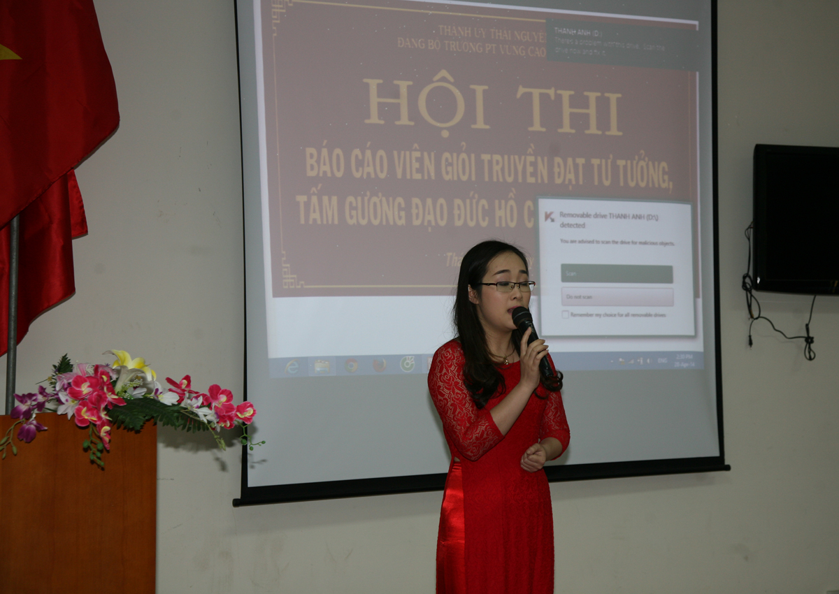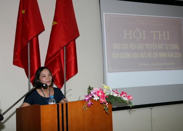 Thực hiện Chỉ thị số 03-CT/TW, ngày 14/5/2011 của Bộ Chính trị về "Tiếp tục đẩy mạnh việc học tập và làm theo tấm gương đạo đức Hồ Chí Minh"; Thực hiện công văn số 517-HD/BTG, ngày 26/3/2014 của Ban Tuyên giáo Thành ủy Thái Nguyên về việc "Thực hiện nội dung thi báo cáo viên giỏi truyền đạt tư tưởng, tấm gương đạo đức Hồ Chí Minh"; Thực hiện công văn số 78-ĐU/VCVB, ngày 29/3/2014 về việc "Tổ chức Hội thi Báo cáo viên giỏi truyền đạt tư tưởng, tấm gương đạo đức Hồ Chí Minh", ngày 28/4/2014 Trường PT Vùng cao Việt Bắc đã tổ chức hội thi “Báo cáo viên giỏi truyền đạt tư tưởng, tấm gương đạo đức Hồ Chí Minh”.