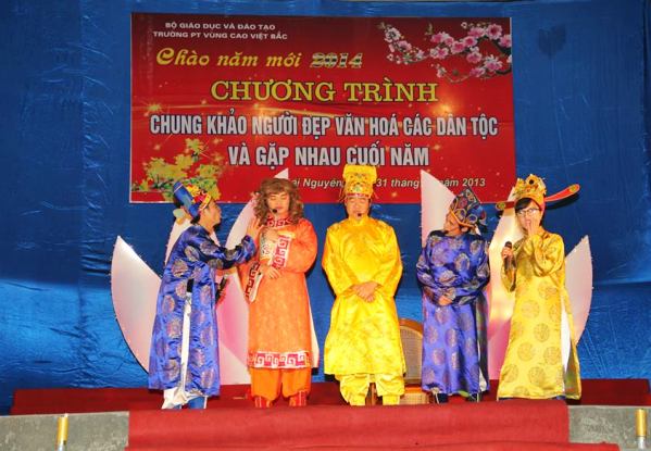 “Chào năm mới” luôn là chương trình được đông đảo các bạn học sinh trong toàn trường háo hức chờ đợi nhất vào ngày cuối cùng của năm. Năm nay, không khí chào đón năm mới càng sôi động hơn bao giờ hết bởi chương trình “Chào năm mới 2014” hứa hẹn nhiều nội dung thật hấp dẫn. Đó là Vòng Chung khảo “Người đẹp văn hóa các dân tộc” và chương trình “Gặp nhau cuối năm” cùng các tiết mục văn nghệ đặc sắc do các bạn học sinh đạt giải cao trong cuộc thi “Tìm kiếm tài năng trường Phổ thông Vùng cao Việt Bắc” năm 2013 thể hiện.
