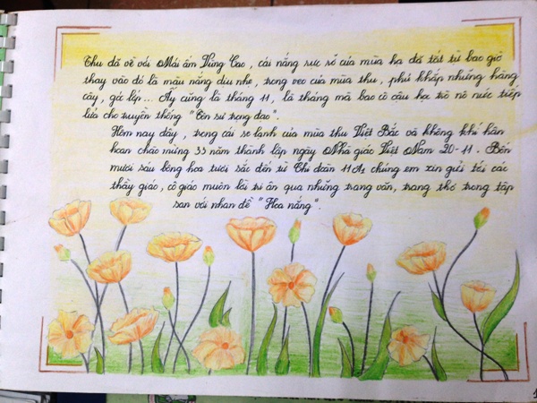 Là một trong những hoạt động thi đua lớn chào mừng 33 năm ngày nhà giáo Việt Nam 20 - 11, cuộc thi “Tập san báo” của các chi đoàn được tổ chức hàng năm là một trong những món quà tặng đặc biệt, thể hiện lòng biết ơn sâu sắc của các thế hệ học trò đối với thầy cô giáo trường PT Vùng cao Việt Bắc nhân ngày Nhà giáo Việt Nam. Đó là những trang văn, trang thơ tri ân cùng nét vẽ dễ thương, những tâm sự, những tình cảm chân thành của học trò với thầy cô giáo.