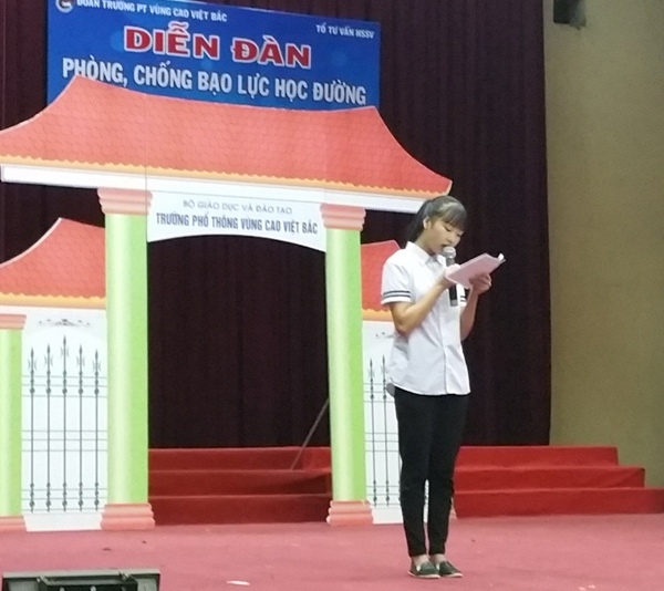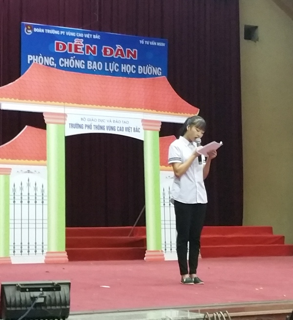 Nhằm trang bị cho Đoàn viên thanh niên (ĐVTN) nhà trường những kiến thức về văn hóa ứng xử, văn minh học đường, đồng thời phát huy vai trò của tổ chức Đoàn trong thực hiện tuyên truyền, giáo dục nâng cao nhận thức cho ĐVTN về vấn đề bạo lực học đường ngày càng phức tạp trong thời gian gần đây; Ngày 05/12/2015, Ban chấp hành Đoàn trường PT Vùng cao Việt Bắc phối hợp với Tổ Tư vấn học sinh sinh viên tổ chức “Diễn đàn Phòng chống bạo lực học đường” năm học 2015 - 2016 cho ĐVTN khối 9, khối 10.