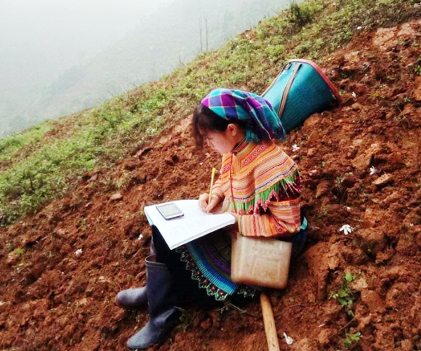 Bạn Hoàng Thị Mỵ tranh thủ học online khi đang lên nương