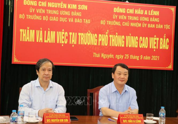 Ngày 25/9, Đoàn công tác của Ủy ban Dân tộc và Bộ Giáo dục và Đào tạo do các đồng chí Ủy viên Trung ương Đảng: Nguyễn Kim Sơn, Bộ trưởng Bộ Giáo dục và Đào tạo; Hầu A Lềnh, Bộ trưởng, Chủ nhiệm Ủy ban Dân tộc dẫn đầu đã đến thăm và làm việc tại Trường phổ thông Vùng cao Việt Bắc - đơn vị trực thuộc Bộ Giáo dục và Đào tạo đứng chân trên địa bàn phường Tân Thịnh, thành phố Thái Nguyên, tỉnh Thái Nguyên.