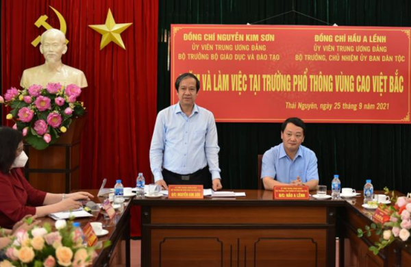 Sáng 25/9, Bộ trưởng Bộ Giáo dục và Đào tạo (GDĐT) Nguyễn Kim Sơn và Bộ trưởng, Chủ nhiệm Ủy ban Dân tộc Hầu A Lềnh cùng đoàn công tác của hai Bộ đã đến thăm và làm việc với Trường Phổ thông Vùng cao Việt Bắc. Cùng đi có Thứ trưởng Bộ GDĐT Ngô Thị Minh, đại diện lãnh đạo một số đơn vị thuộc Bộ GDĐT, Ủy ban Dân tộc.