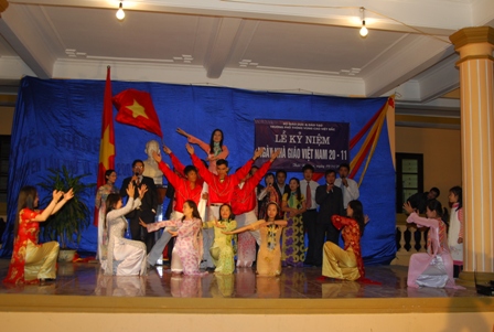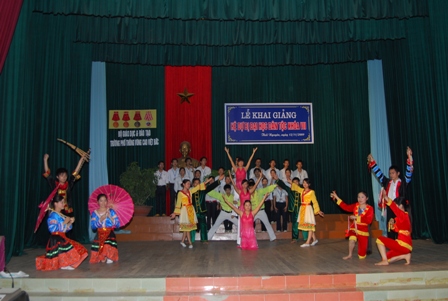 Tổ chức các lễ kỷ niệm để giáo dục truyền thống luôn là hoạt động không thể thiếu của Đảng bộ nhà trường. Ảnh: Múa hát tập thể của chi đoàn giáo viên nhà trường nhân Lễ kỷ niệmngày Nhà giáo Việt Nam 20-11