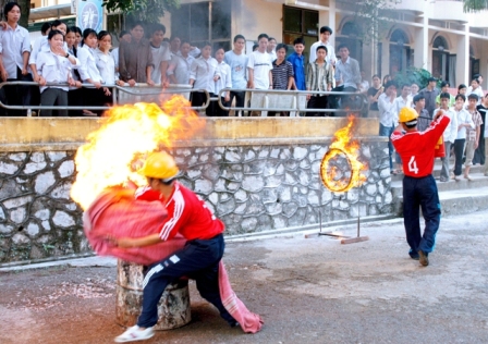 Công tác giữ gìn trật tự an ninh, phòng chống cháy nổ, phòng chống ngộ độc thực phẩm và dịch bệnh luôn được Đảng ủy chú ý tìm giải pháp triển khai thường xuyên và đã thu được kết quả tốt, nhiều năm liền không để xảy ra vụ việc nào. Ảnh: Một cuộc diễn tập chữa cháy của đội tự vệ nhà trường.