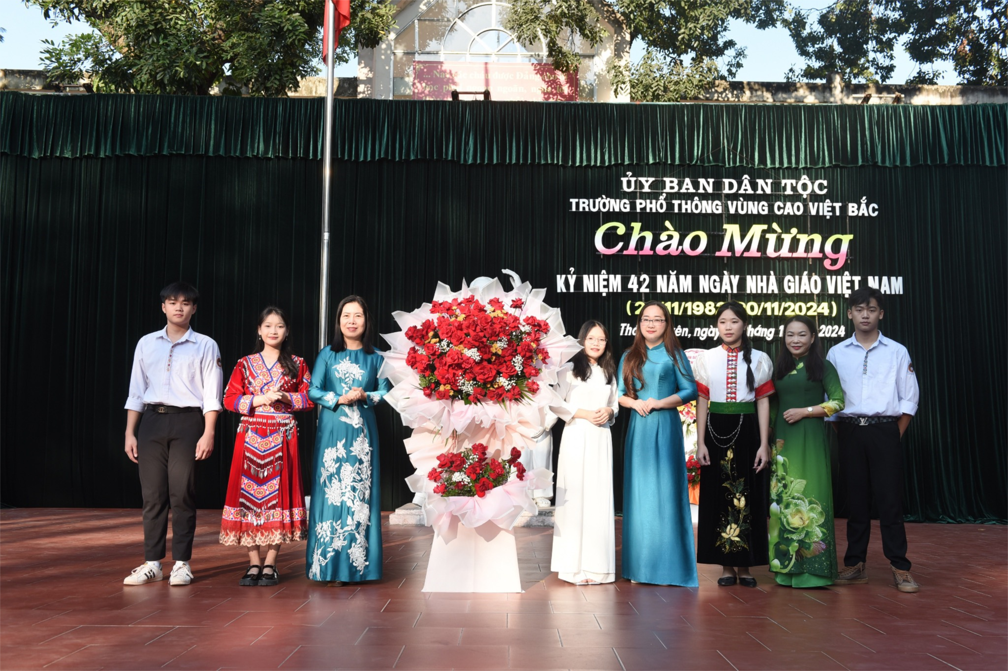 Để bày tỏ lòng biết ơn sâu sắc đối với công ơn dạy dỗ, chỉ bảo của các Thầy cô giáo, em Hoàng Thị Kim Ngân - Học sinh lớp 12C1, đại diện học sinh toàn trường đã lên phát biểu tri ân và kính tặng các Thầy cô giáo những bó hoa tươi thắm cùng lời chúc tốt đẹp nhất. Với mỗi học sinh trường PT Vùng cao Việt Bắc, “Tôn sư trọng đạo” là truyền thống quý báu, mãi mãi được khắc sâu trong lòng. Các em hứa sẽ luôn cố gắng, nỗ lực trong học tập và rèn luyện để không phụ lòng mong mỏi của các Thầy cô.