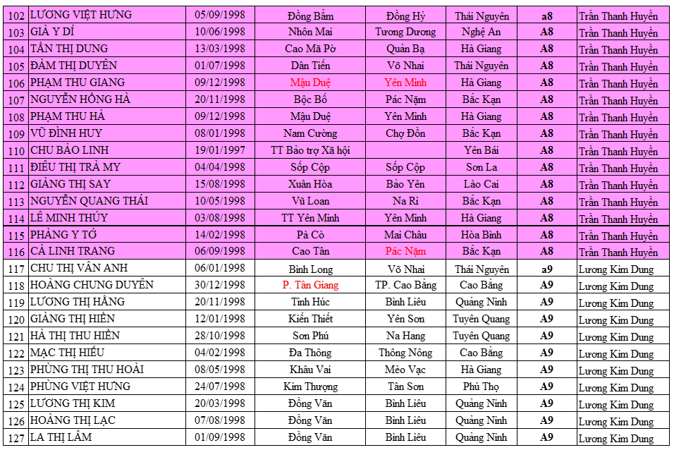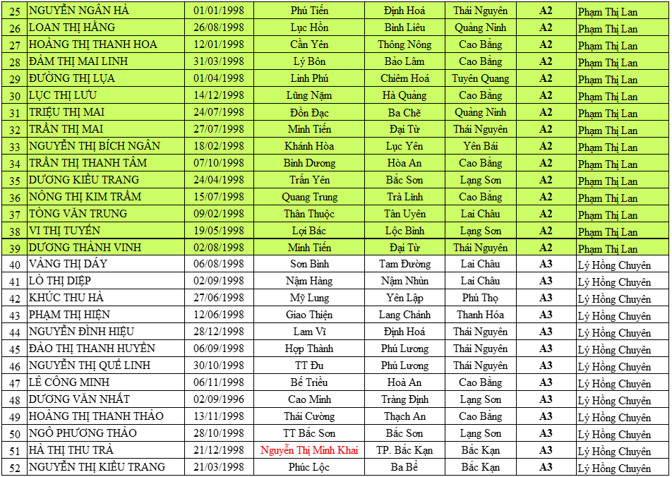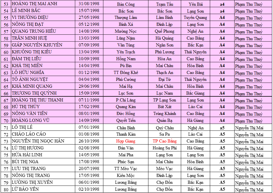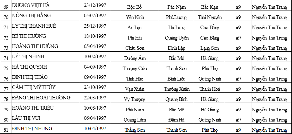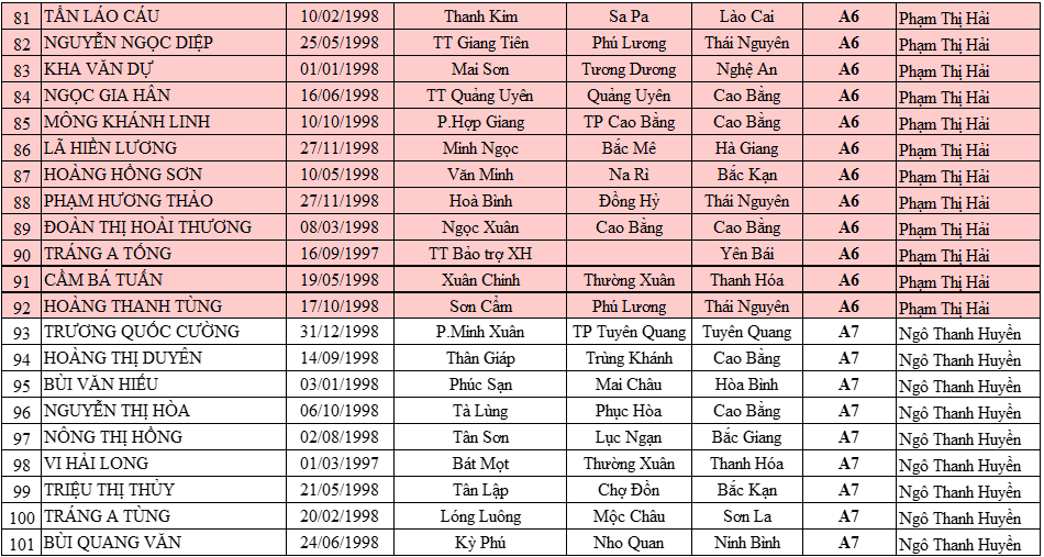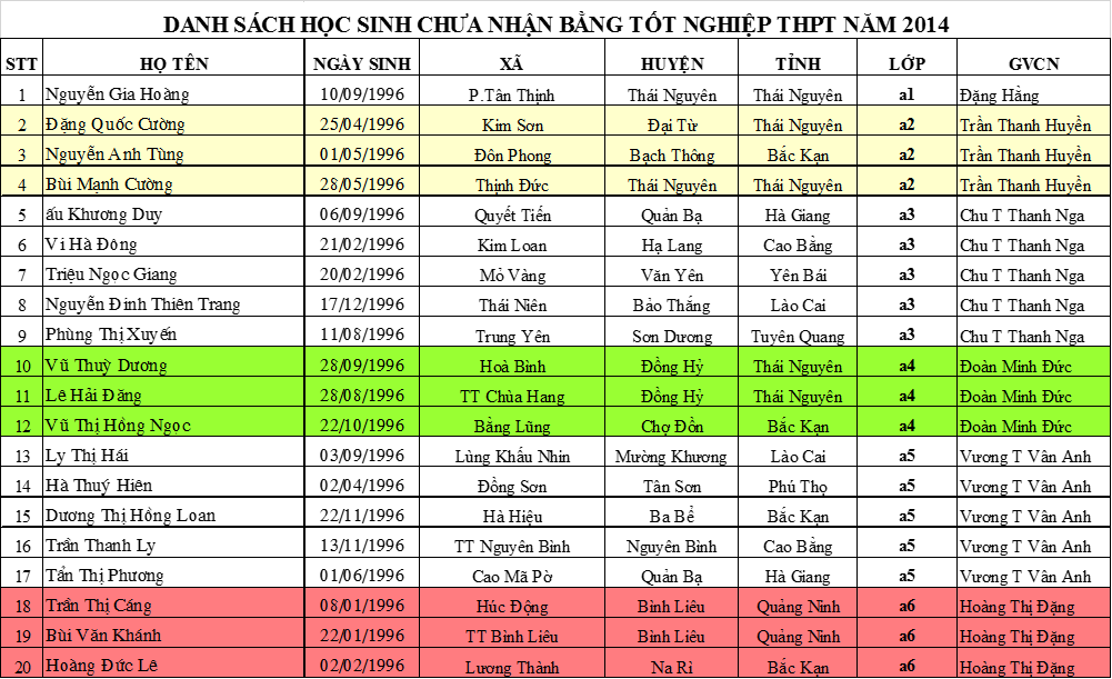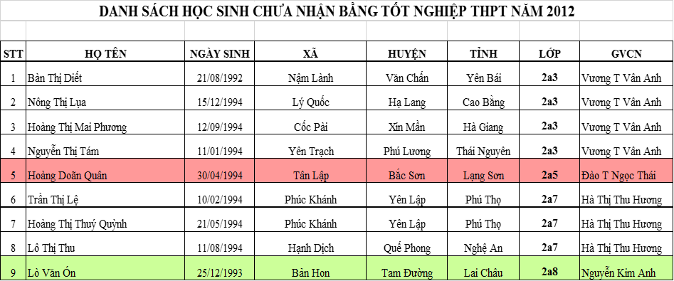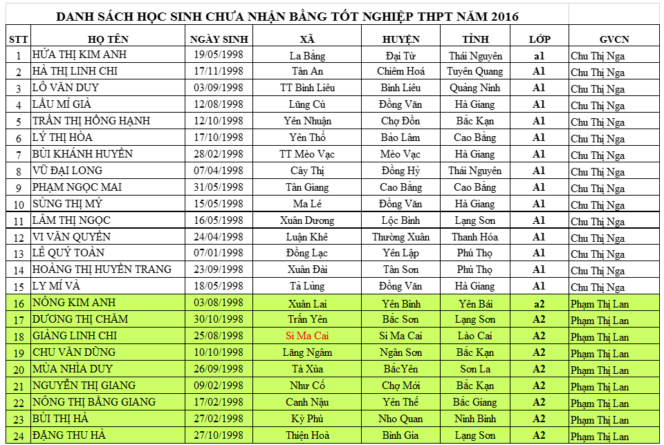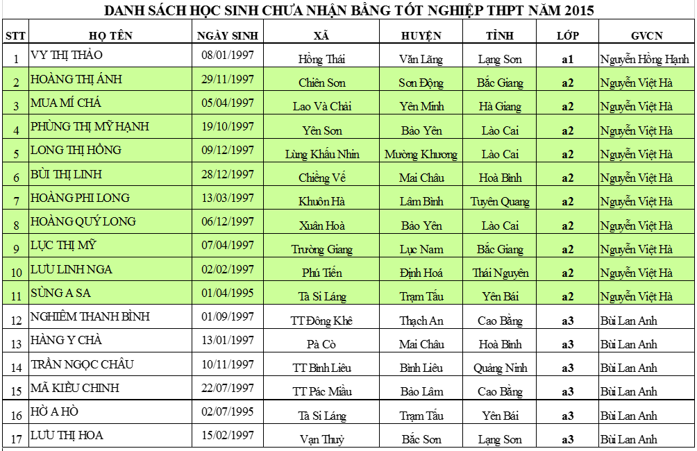 Thực hiện công văn số 1925/SDGĐT - KTKĐCLGD ngày 21 tháng 11 năm 2017 của Sở Giáo dục và Đào tạo Thái Nguyên về việc trả bằng tốt nghiệp THPT cho những học sinh đã Tốt nghiệp THPT nhưng chưa đến nhận Bằng, Trường PT Vùng cao Việt Bắc xin thông báo đến học sinh và gia đình học sinh biết để đến nhận bằng.