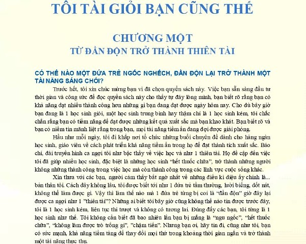 Cho dù bạn là ai, đang ở đâu, đang học trường nào, đang hướng tới bất kỳ mục tiêu gì trong học tập và cuộc sống, tôi xin chắc chắn với bạn một điều rằng bạn sẽ tìm được câu trả lời trong cuốn sách “Tôi tài giỏi, bạn cũng thế”, cuốn sách chứa đựng những bí kíp giúp tác giả Adam Khoo lập nên kỳ tích.