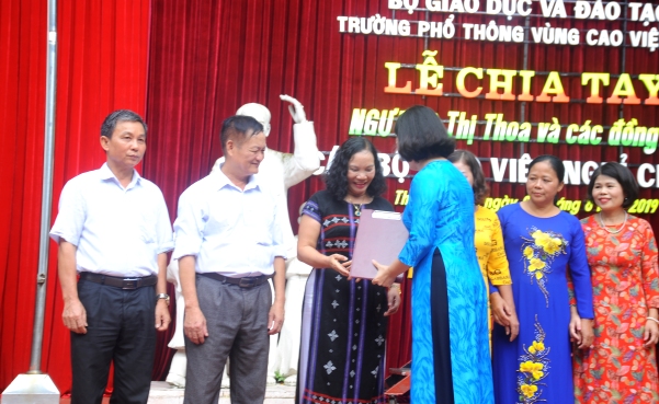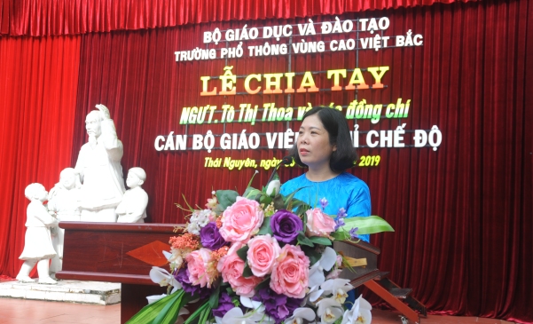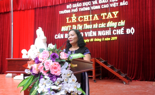 Thay mặt nhà trường, Nhà giáo Lục Thúy Hằng - Bí thư Đảng ủy, Hiệu trưởng nhà trường đã ôn lại quá trình công tác và những cống hiến của Nhà giáo Ưu tú Tô Thị Thoa cùng 05 thầy cô đối với ngành giáo dục nói chung và sự nghiệp giáo dục dân tộc tại trường PT Vùng cao Việt Bắc nói riêng trong suốt hơn 30 năm. Đồng thời, nhà giáo Lục Thúy Hằng cũng gửi tặng đến các đồng chí những lời chúc tốt đẹp nhất và mong muốn các đồng chí sau khi nghỉ chế độ vẫn tiếp tục cộng tác, cống hiến tâm huyết, trí tuệ và kinh nghiệm của mình vào sự phát triển chung của nhà trường trong những năm tiếp theo.