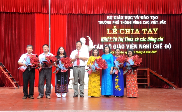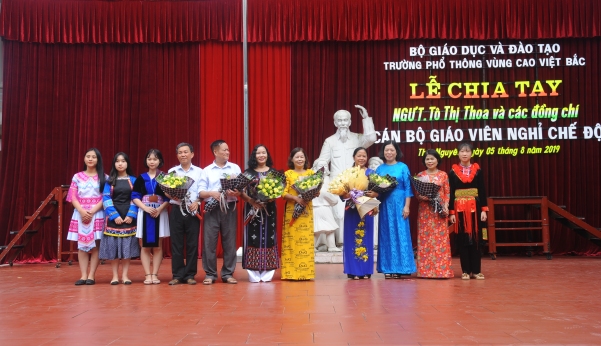 Sáng ngày 05 tháng 08 năm 2019, trong không khí trang trọng và đầm ấm tình đồng chí, đồng nghiệp, trường PT Vùng cao Việt Bắc đã tổ chức Gặp mặt chia tay NGƯT Tô Thị Thoa; Nhà giáo Trần Thị Kim Oanh, nhà giáo Đào Thị Ngọc Thái, nhà giáo Lê Thị Anh Châm; nhà giáo Nguyễn Hữu Thăng và đồng chí Nguyễn Mạnh Tưởng về nghỉ chế độ.