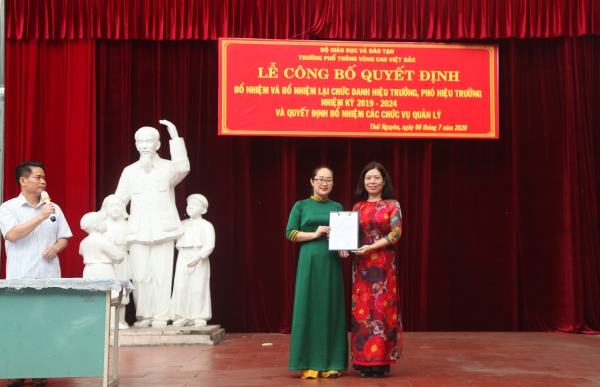 Thực hiện quy trình công tác cán bộ, trong năm học 2019 - 2020 Trường PT Vùng cao Việt Bắc đã tiến hành các bước trong quy trình bổ nhiệm, bổ nhiệm lại chức danh hiệu trưởng, phó hiệu trưởng, các chức danh cán bộ quản lý và trang trọng tổ chức lễ công bố quyết định bổ nhiệm, bổ nhiệm lại năm 2020 cho các đồng chí: