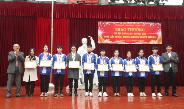 Cũng tại buổi lễ trao thưởng, thầy giáo Vũ Huy Kỳ - Phó Hiệu trưởng nhà trường cũng đã trao tặng phần thưởng cho thầy giáo Lương Văn Luyện - Giáo viên bộ môn Vật lý - đạt giải Ba tại Hội thi Sáng tạo kỹ thuật tỉnh Thái Nguyên lần thứ X, năm 2020.