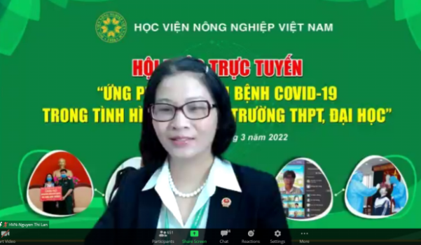 Theo GS.TS. Nguyễn Thị Lan, hiện nay, nhiều quốc gia trên thế giới đã thực hiện thay đổi chiến lược ứng phó với dịch bệnh COVID-19 từ gắng sức dập dịch dứt điểm chuyển sang chung sống an toàn với dịch bệnh, Việt Nam cũng trong xu hướng đó. Trước tình hình đó, Học viện Nông nghiệp Việt Nam tổ chức Hội thảo trực tuyến “Ứng phó với dịch bệnh COVID-19 trong tình hình mới của các trường THPT, đại học” nhằm đưa ra những quan niệm mới về dịch bệnh COVID-19 và thích ứng mới trong giai đoạn hiện nay, các giải pháp an toàn trường học để đối phó với dịch bệnh COVID-19.