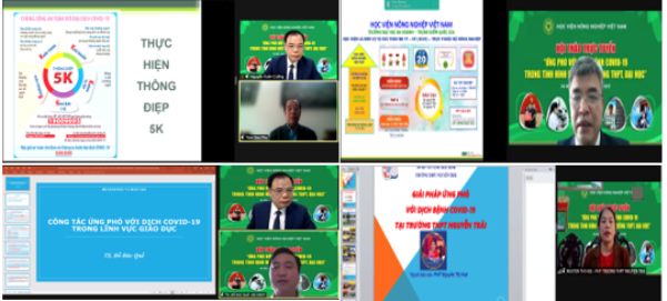 Về phía đơn vị thực hiện, đại diện Học viên Nông nghiệp, GS.TS. Phạm Văn Cường cũng chia sẻ Học viện Nông nghiệp Việt Nam đã xây dựng và tổ chức thực hiện kế hoạch dạy - học online, đảm bảo chất lượng đào tạo, an toàn trường học và sức khỏe cho cán bộ, viên chức, sinh viên. Ngoài ra trong năm học 2020-2021, Học viện không chỉ thực hiện các biện pháp phòng chống dịch bệnh trong khuôn viên và hỗ trợ sinh viên mắc kẹt tại Hà Nội, Học viện còn nghiên cứu, chế tạo ra nước sát khuẩn tay dành tặng cho hàng trăm doanh nghiệp, cơ quan nhà nước và các trường THPT có nhiều đóng góp trong sự nghiệp đào tạo của Học viện.