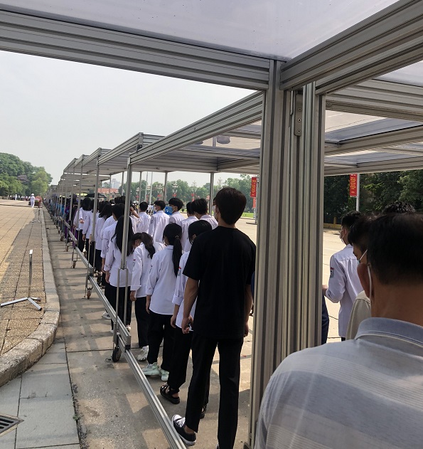 Địa điểm đầu tiên mà chúng em đặt chân tới đó là Lăng Chủ tịch Hồ Chí Minh. Đến cổng vào Lăng, sau khi qua dãy hành lang dài, cuối quảng trường Ba Đình lịch sử, lăng Bác hiện ra uy nghi trước mắt, nơi yên nghỉ của vị Cha già kính yêu, một “vầng Thái Dương” của dân tộc Việt Nam.